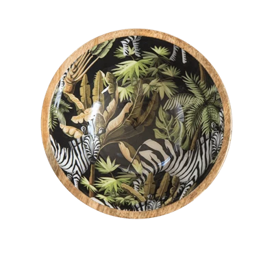 Op zoek naar een stijlvolle schaal om (zomerse) salades of andere gerechten te serveren? Dit exemplaar van By Room is er één voor op uw wensenlijst! Het item is vervaardigd uit mangohout en heeft een rond design met een diameter van 25 cm. De binnenkant is voorzien van een sticker met zebra in jungle print voor een speels effect. Combineer de schaal met het bijpassende slacouvert voor een elegant geheel.