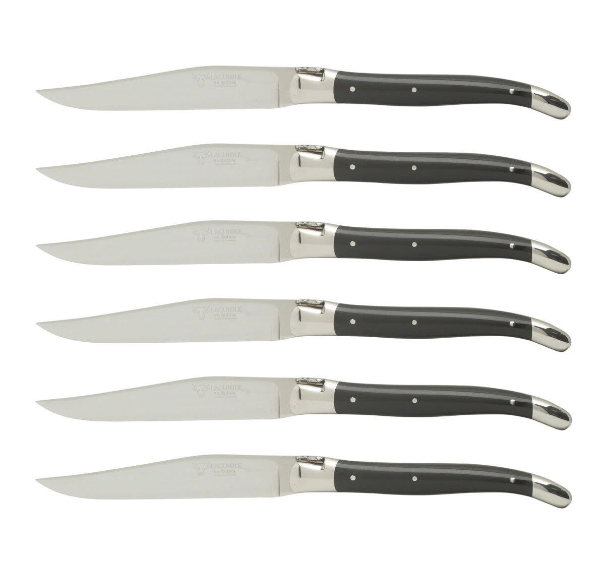Deze set van 6 Laguiole steakmessen heeft heften van Corian. Het betreft een zwart kunststof heft. Corian is een kunsthars dat zich laat bewerken als hout en heeft een glad niet-poreus oppervlak. De lemmeten van de messen zijn van messenstaal, met een angel die tot achteraan het heft doorloopt.
