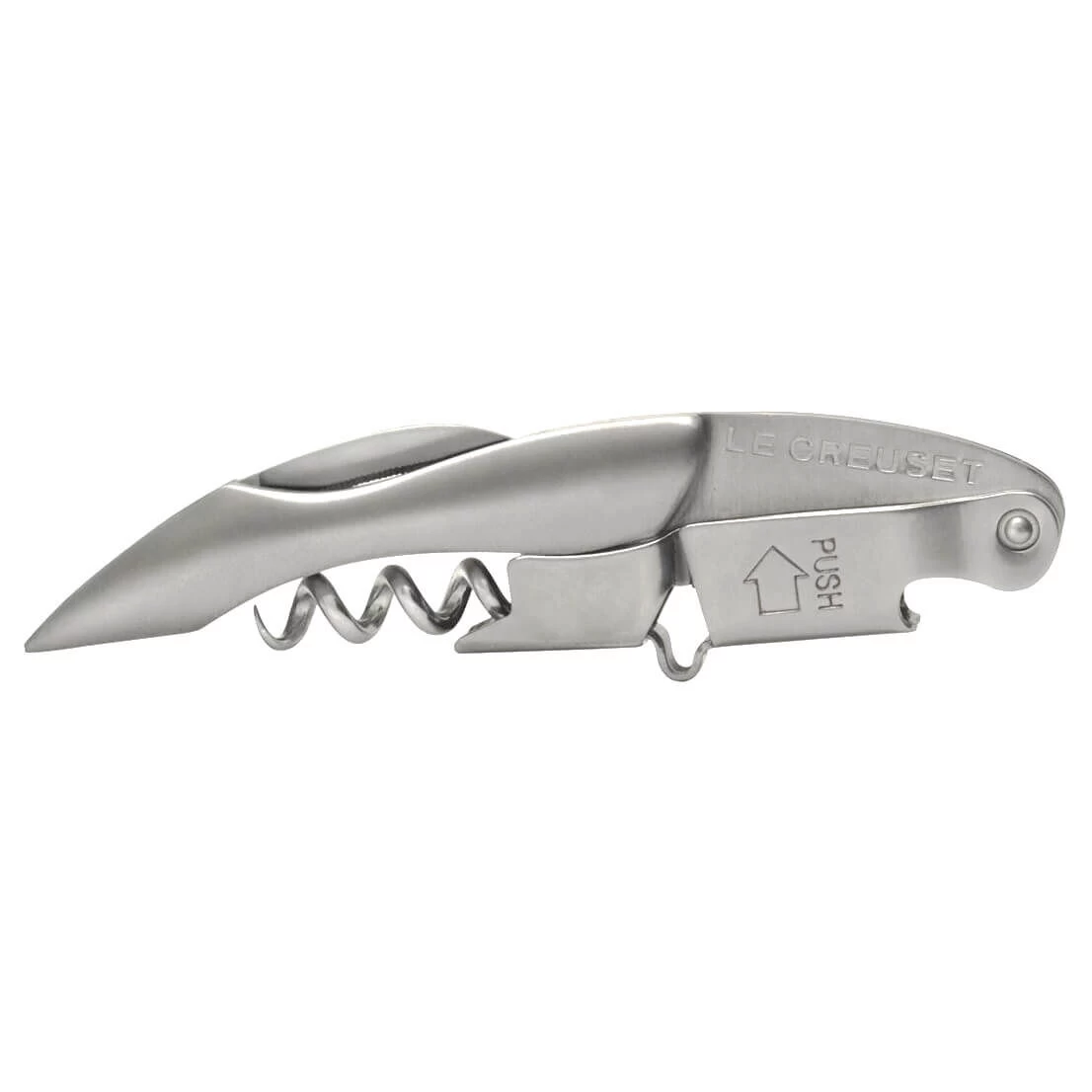 Het Le Creuset Screwpull WT-110S kelnersmes is vervaardigd uit chroomkleurig roestvrij staal. Het kelnersmes heeft een lengte van 12 cm. De opener is een kurkentrekker, flessenopener en capsulesnijder in één.