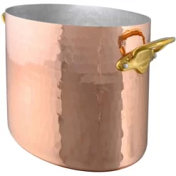 De van gehamerd koper gemaakte ovale Mauviel M’30 champagnekoeler is geschikt voor 2 flessen champagne van 0,75 liter (bouteilles). De emmer is 26 cm lang en 20 cm en aan de uiteinden voorzien van messing grepen. De wijnemmer is aan de binnenzijde vertind om oxideren van het koper te voorkomen. Vul de koeler met water en ijs voor het koelen van mousserende wijnen.