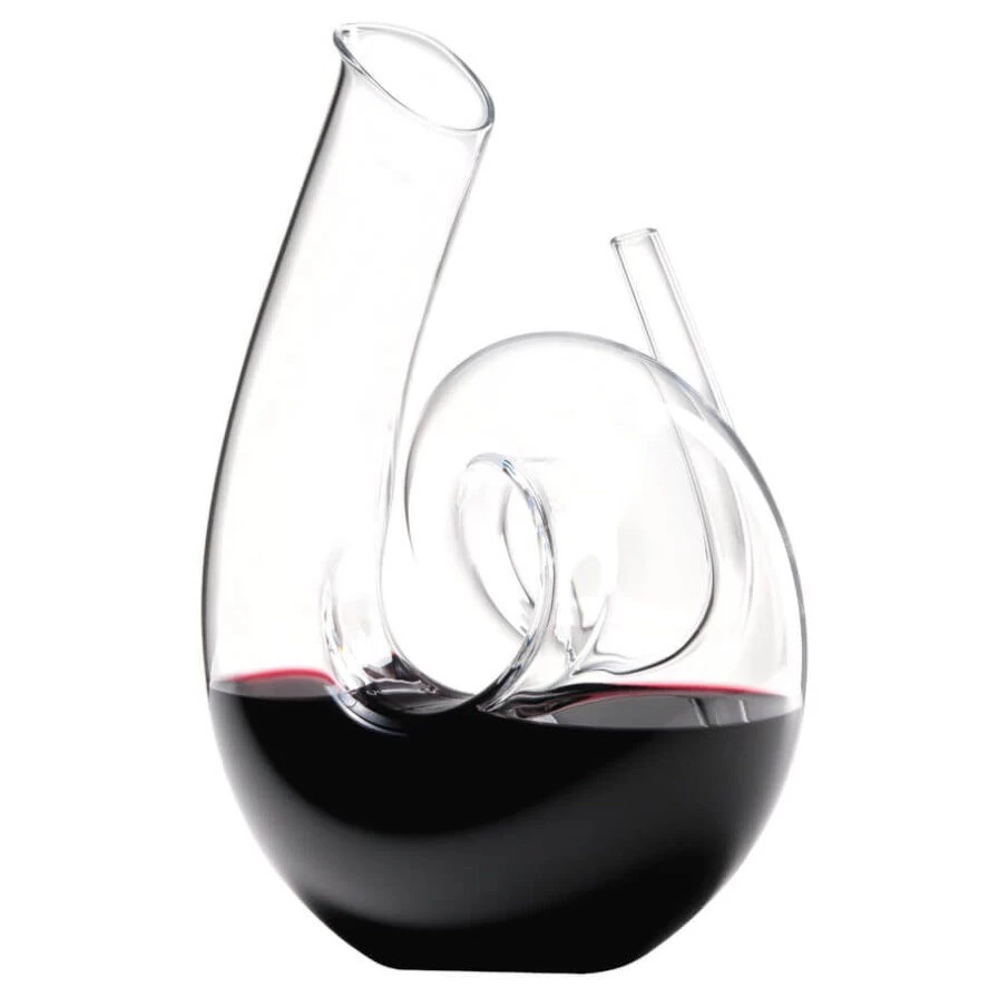 De Riedel Curly Clear decanteerkaraf is gemaakt van kristalglas en heeft een inhoud van 1,4 liter. De karaf heeft een hoogte van 26,5 cm en is gevormd als een grote krul met een grote schenktuit en een beluchtingsopening.Â
