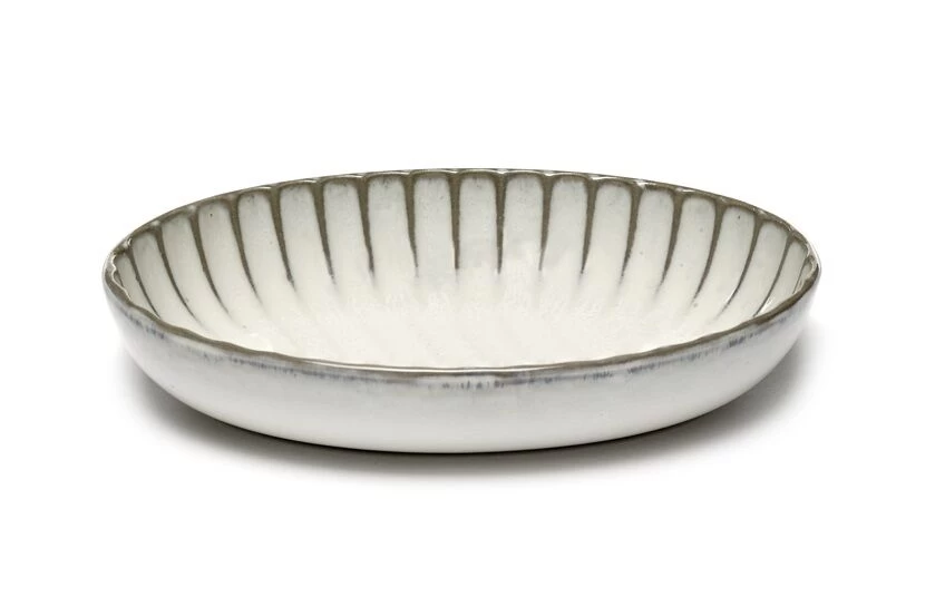 De ovale serveerschaal van Serax INKU heeft een diameter van 19 x 13 cm en is 3,7 cm hoog, en is aan de rand voorzien van een decoratief ribbelpatroon. De kom is gemaakt van steengoed (aardewerk) en is wit geglazuurd. Gebruik voor het serveren van gerechten.