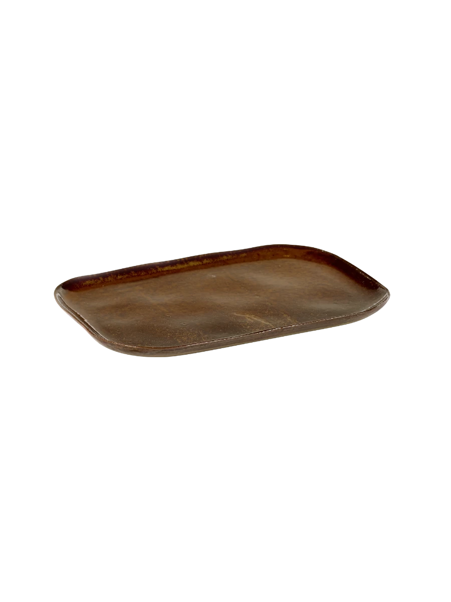 Het rechthoekige Merci bord van Serax is gemaakt van okerbruin zandsteen. Het bord is 23 cm lang, 15 cm breed en 1,4 cm hoog.Â